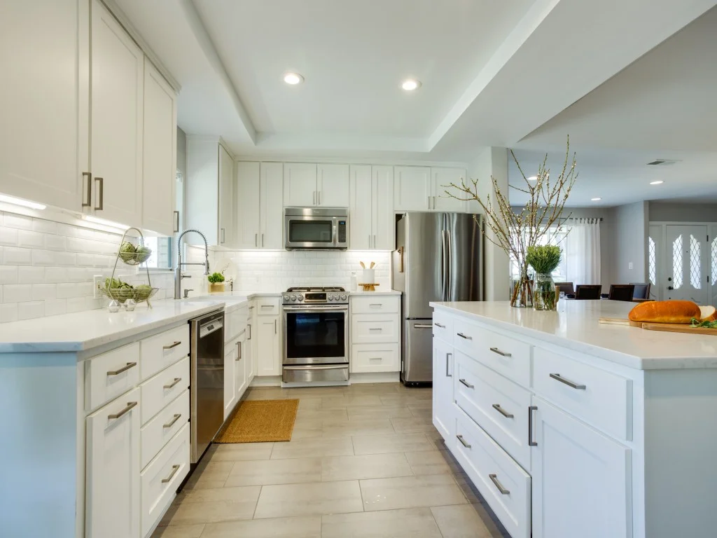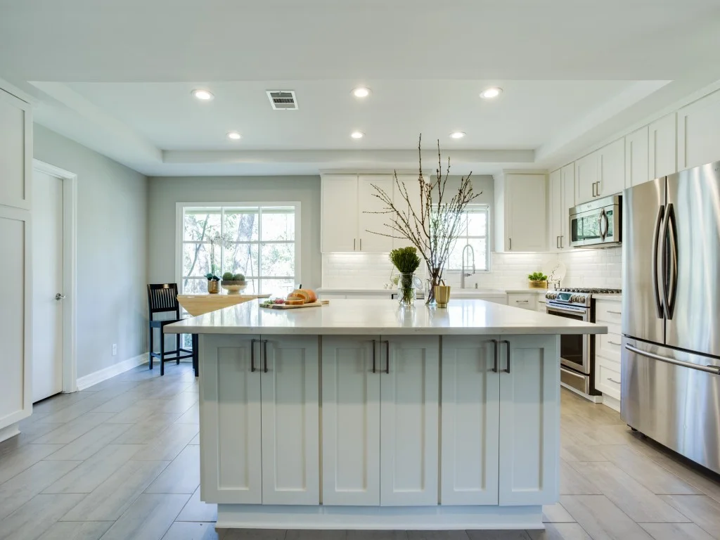 So, we opened it up! Bright white countertops and cabinets to the ceiling make the room feel bigger. A new custom center island anchors the space and adjoining rooms. The larger island adds storage, which is in addition to a built-in floor-to-ceiling cabinet and new adjacent mudroom storage as well. New flooring, paint and a pillowed subway backsplash complete the look.