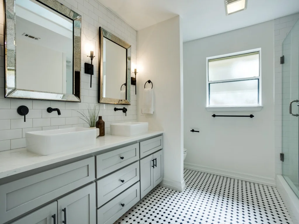 Voila! Wall faucets add countertop space, his and her mirrors on a subway backdrop bring depth, and clean hardware with Benjamin Moore paint makes the heart smile. Who wouldn't want to start their day in here?