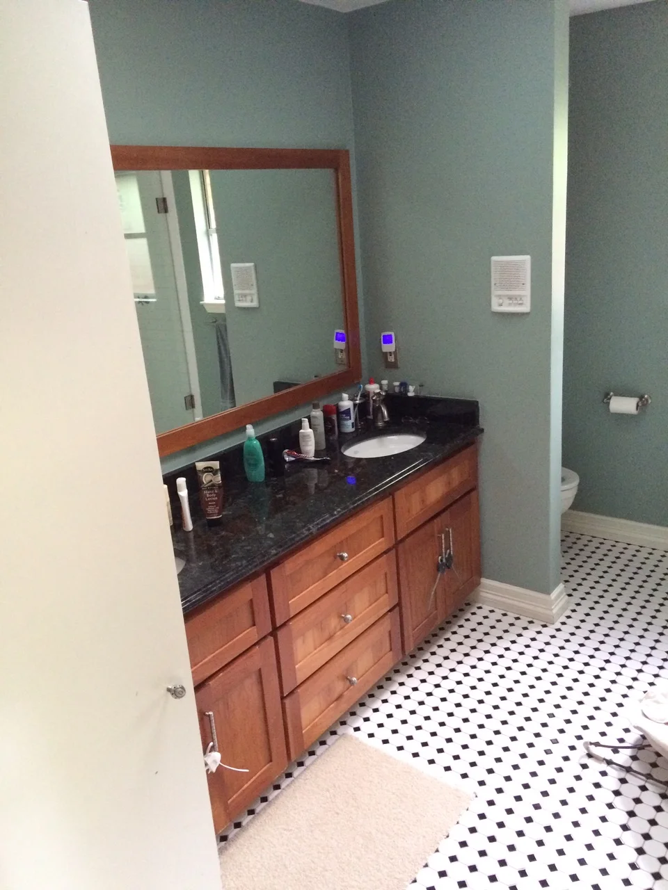 Previously, the bathroom had dark counters, and a cherry wood our client didn't care for. Additionally, there was some sort of dated intercom in the wall that might contact RoboCop, and lighting was scant.